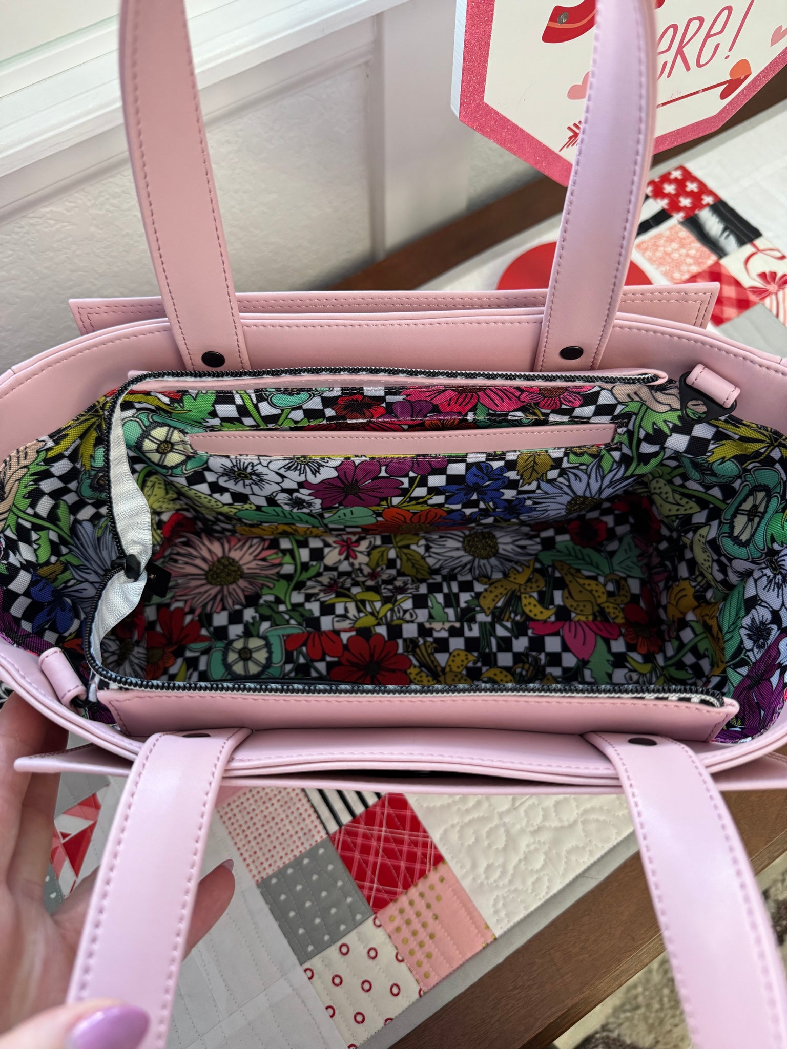 Gorgeous larger handbag with lots of features! Two full size slip pockets front and back, zipper top closure, and three pockets inside. Pattern from Kaur Threads finished size is 13x9x5