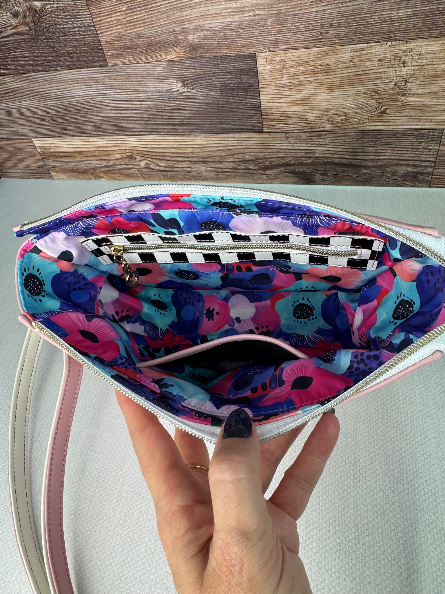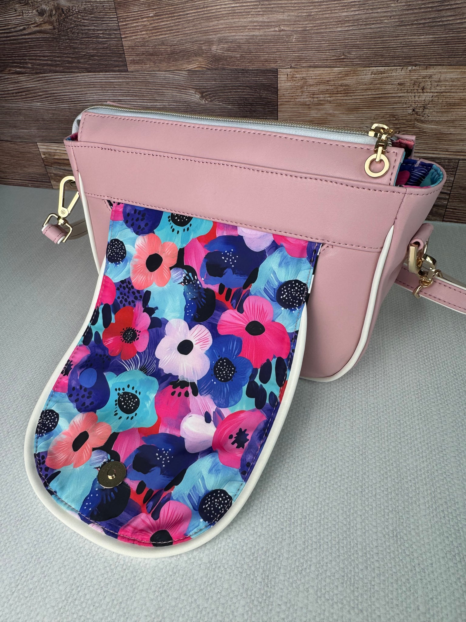Cute little crossbody bag, full zipper closure, with flap. Outside slip pocket and inside slip and zipper pocket. Pattern by KDill Handmade