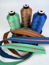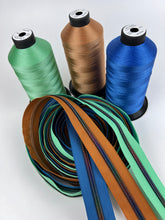 These #5 Nylon Zipper Tape Packs come in 7 different finishes and match three of the thread colors, in 3 yard cuts for a total of 9 yards per by pack. Choose from Nickel, Gunmetal, Antique Brass, Gold , Black, Rainbow, and Rose Gold. (Threads not included- just to show match )