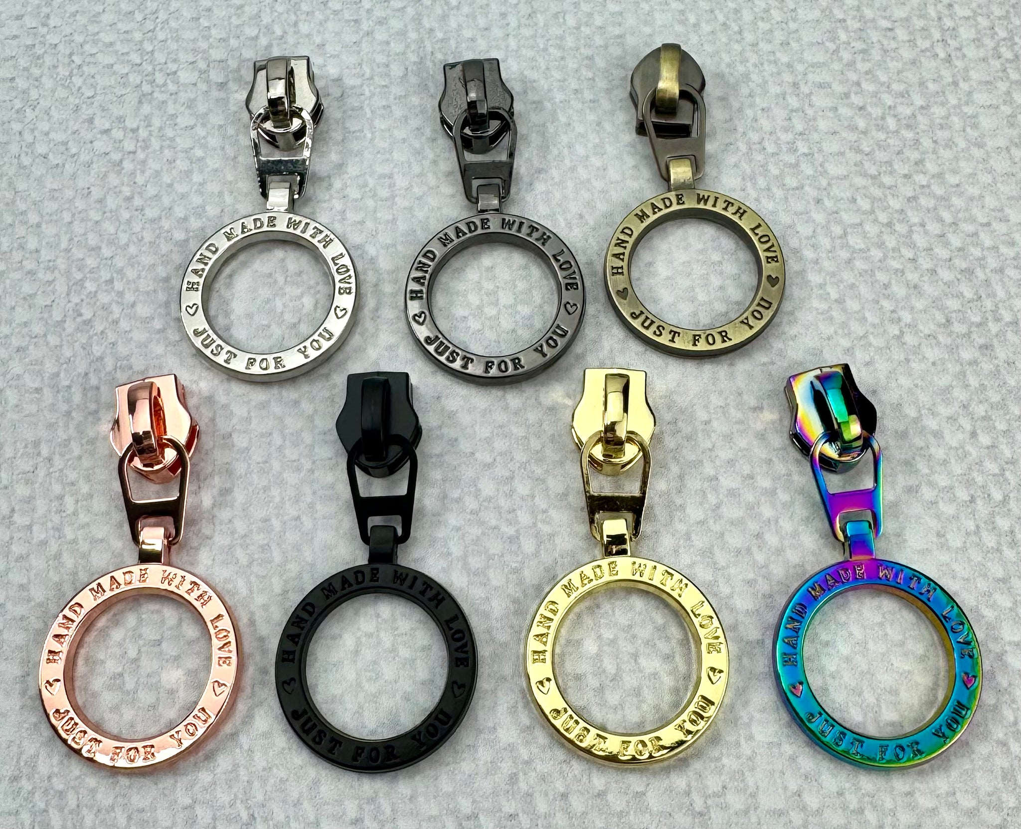 New Hand Made With Love #5 Zipper pulls for Nylon zipper tape.  These come in pack of 5, and 7 different finishes.  Please be aware the Gold does not match the Light Gold perfectly from my hardware collection, but still looks great!